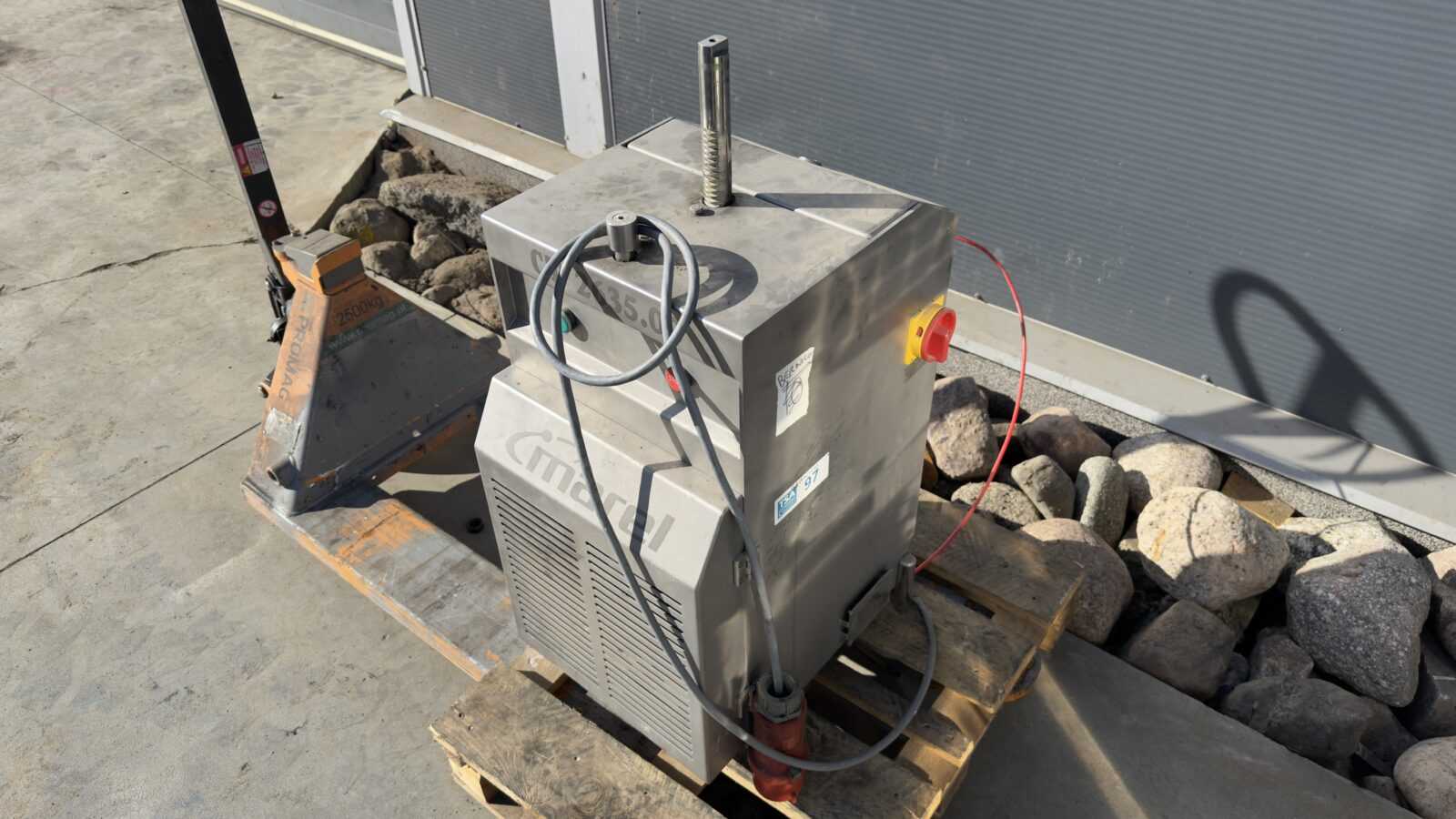 Key parameters and design: The device has a compact, ventilated housing made entirely of acid-resistant stainless steel, facilitating the maintenance of strict hygiene standards. The main working element is an extendable, vertical shaft. The equipment is operated using an intuitive panel with buttons (green/red). The machine is also equipped with a main power switch located on the side and a thick cable with a heavy-duty power plug.