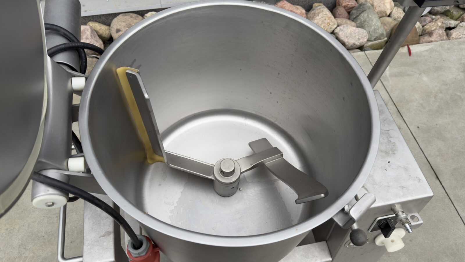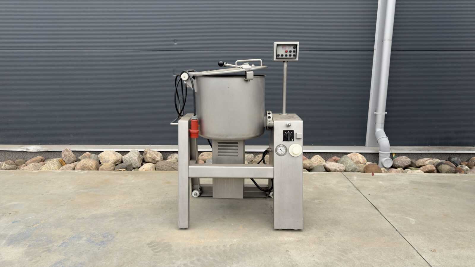 Kluczowe parametry i budowa: Egzemplarz charakteryzuje się solidną konstrukcją w całości wykonaną ze stali nierdzewnej, posadowioną na stabilnej ramie z kółkami, co ułatwia jej transport i przemieszczanie podczas mycia. Urządzenie jest wyposażone w szczelną pokrywę oraz zintegrowaną pompę próżniową z widocznym manometrem. Wnętrze wychylnej misy kryje solidne ramię mieszające ze zgarniaczem, które zapobiega przyklejaniu się surowca do ścianek. Całością steruje się za pomocą wygodnego panelu na ramieniu. Urządzenie sprzedawane jest w stanie widocznym na załączonych zdjęciach. Ekipa BMC MachFood oferuje również możliwy remont maszyny – możemy ją dla Ciebie kompleksowo odrestaurować i przygotować do wielozmianowej pracy.