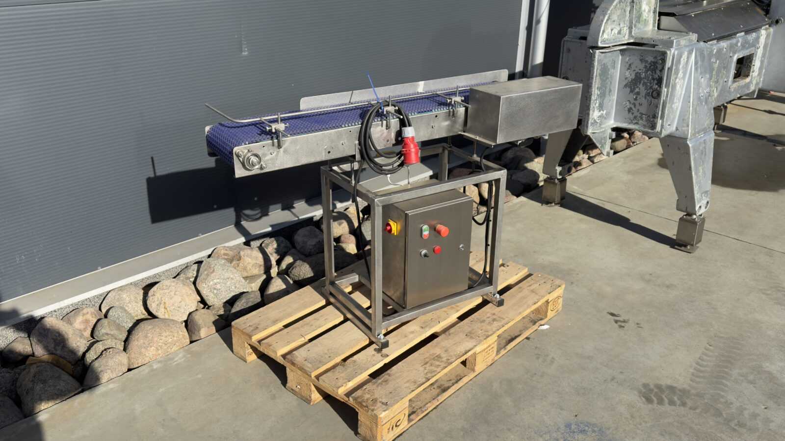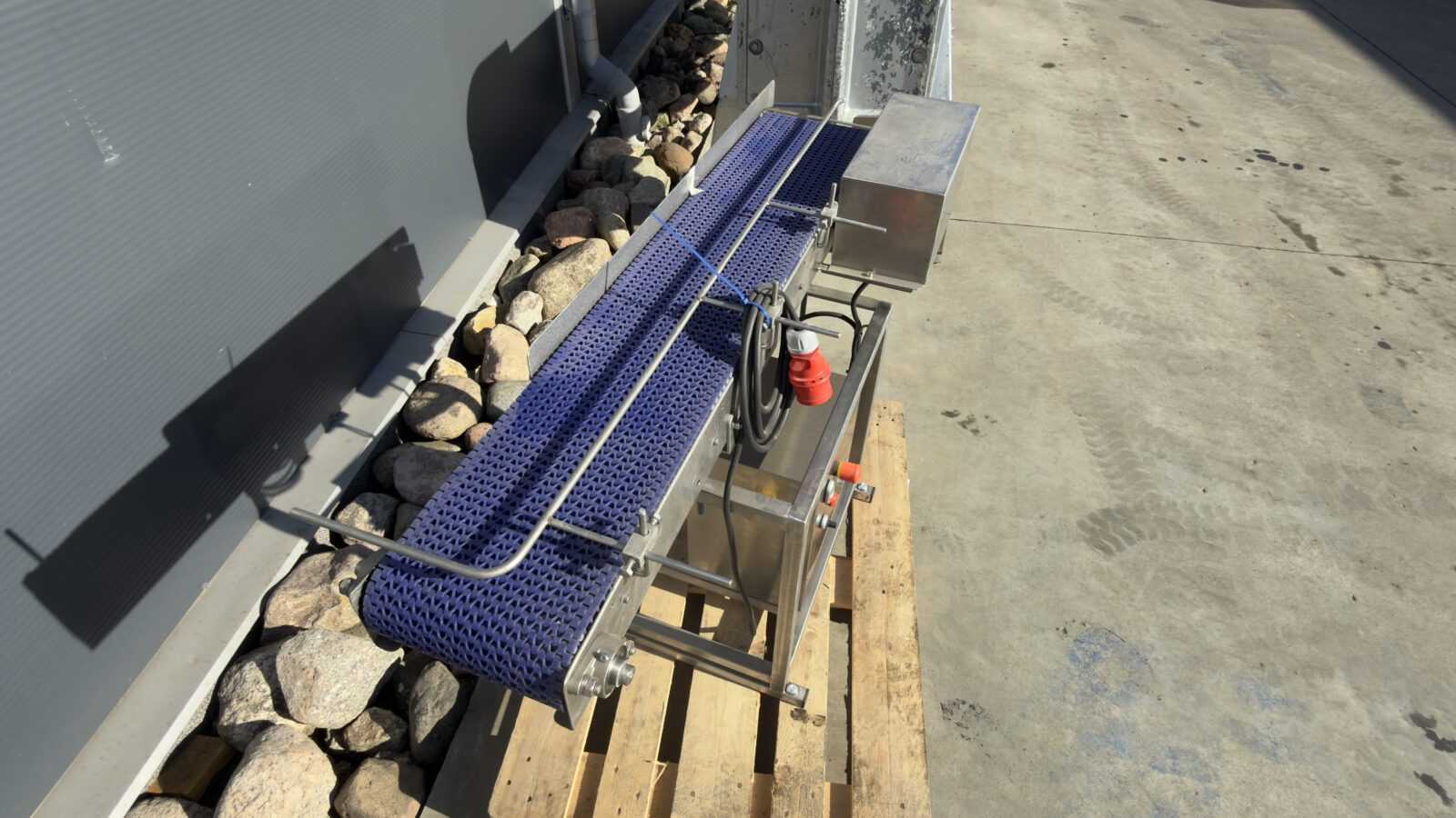 Kluczowe parametry i budowa: Urządzenie posiada solidną konstrukcję wykonaną z kwasoodpornej stali nierdzewnej, całkowicie odporną na korozję i trudne warunki pracy (np. wilgoć). Transporter przesuwa ładunek na wytrzymałej taśmie modułowej z tworzywa, a pozycję produktu stabilizują regulowane prowadnice prętowe o wymiarach 23,5 x 125 cm. Maszyna jest w pełni niezależna dzięki wyposażeniu we własną szafkę sterowniczą.
